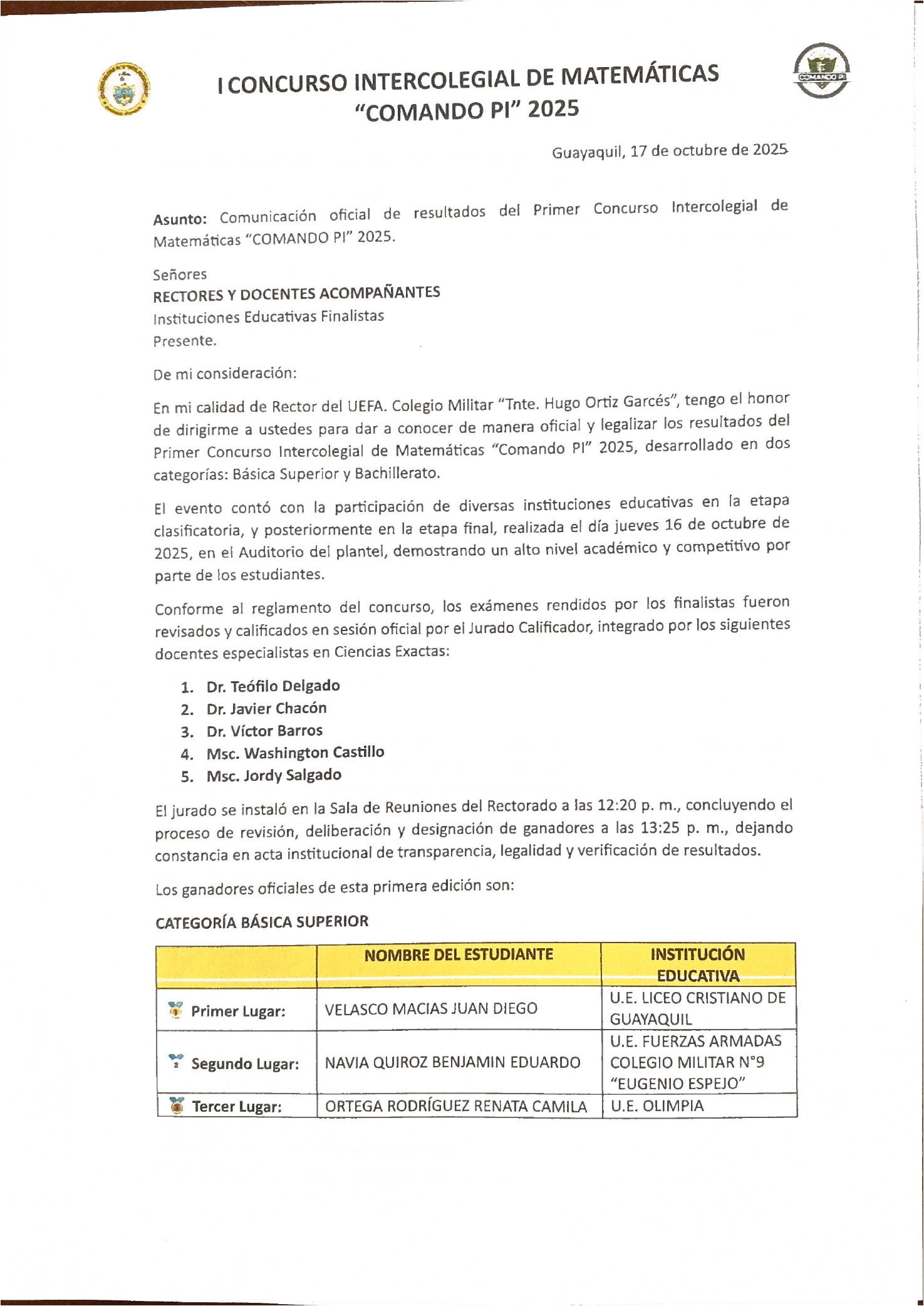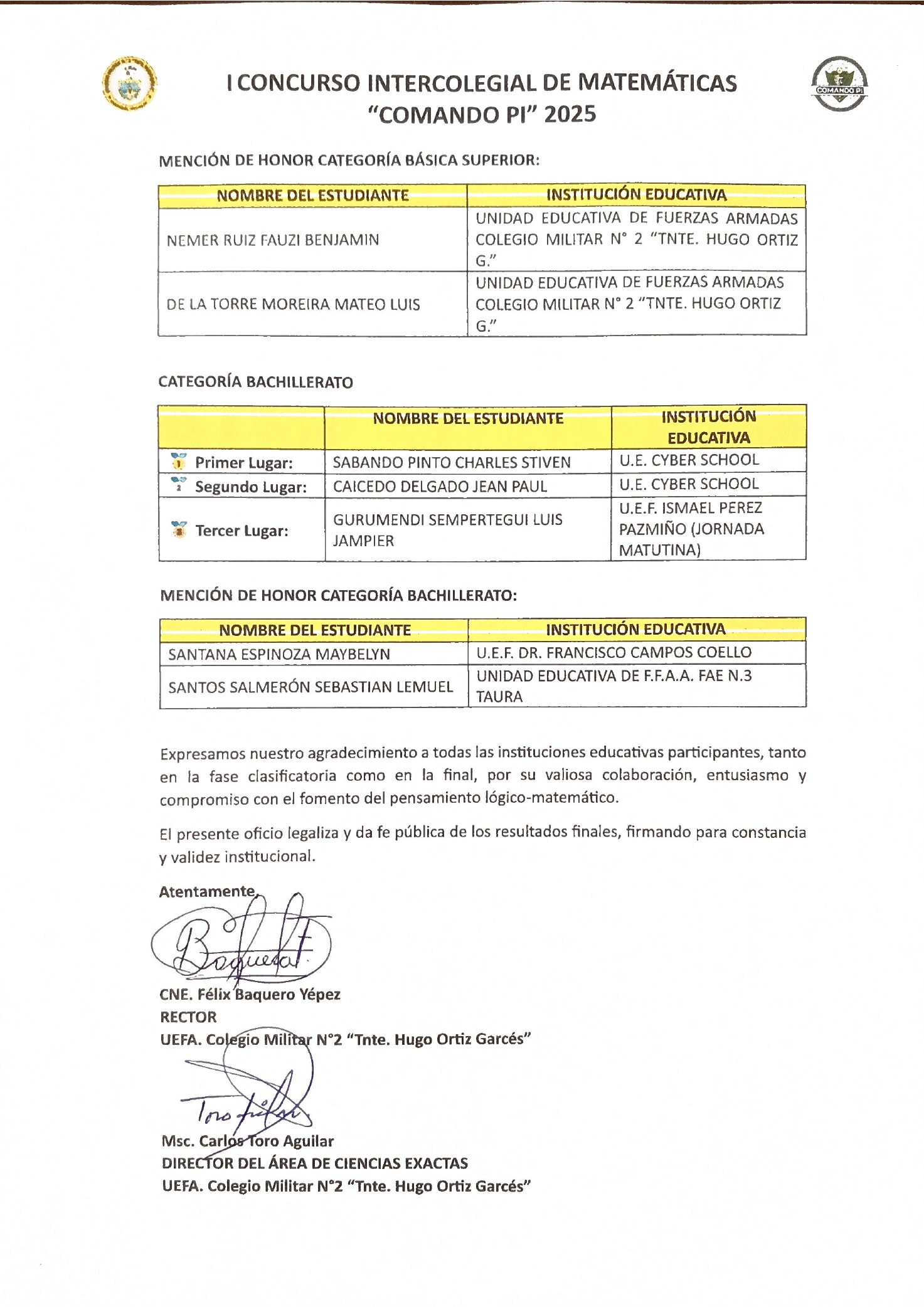 El Colegio Militar Nro. 2 “Tnte. Hugo Ortiz Garcés” tiene el honor de comunicar oficialmente los resultados del Primer Concurso Intercolegial de Matemática “COMANDO PI” 2025, certamen académico que reunió a destacados estudiantes de diversas instituciones educativas del país en las categorías Básica Superior y Bachillerato.